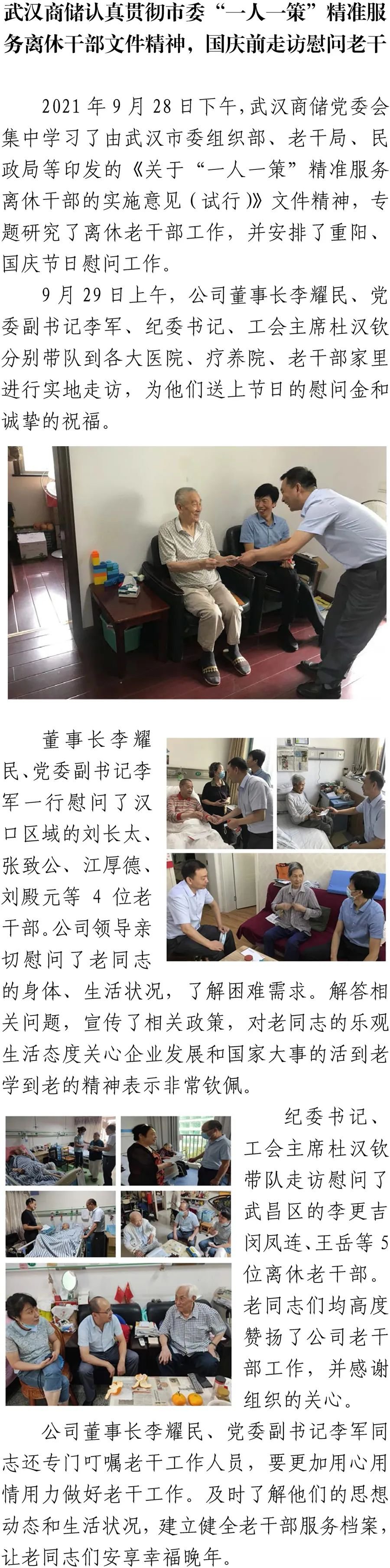 武漢商儲貫徹落實武漢市《關(guān)于“一人一策”精準服務離休干部的實施意見(試行)》 時間:2021-09-30 點擊量:次